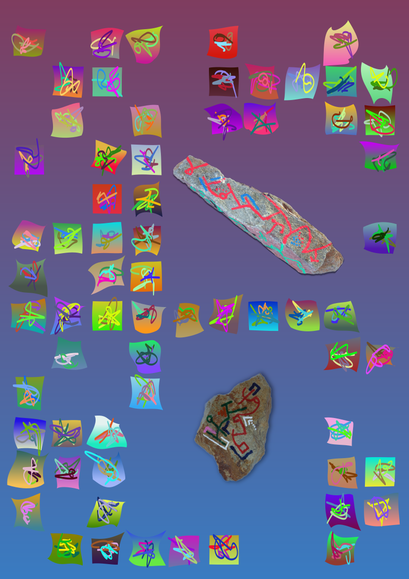 Here are some asemic stone stories. I wrote on the stones, photographed them, and added them to a digital asemic background.